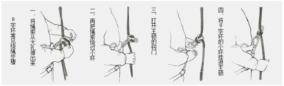 第二步:系好安全帶和8字環(huán)、掛扣相鏈接。將繩索從大孔伸出來(lái),再把繩索繞過(guò)小環(huán),打開主鎖的鉤門,將8字環(huán)的小環(huán)掛進(jìn)主鎖(如下圖)。